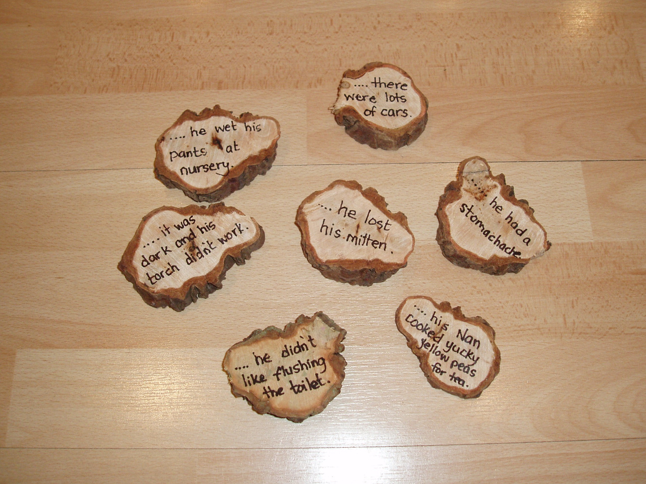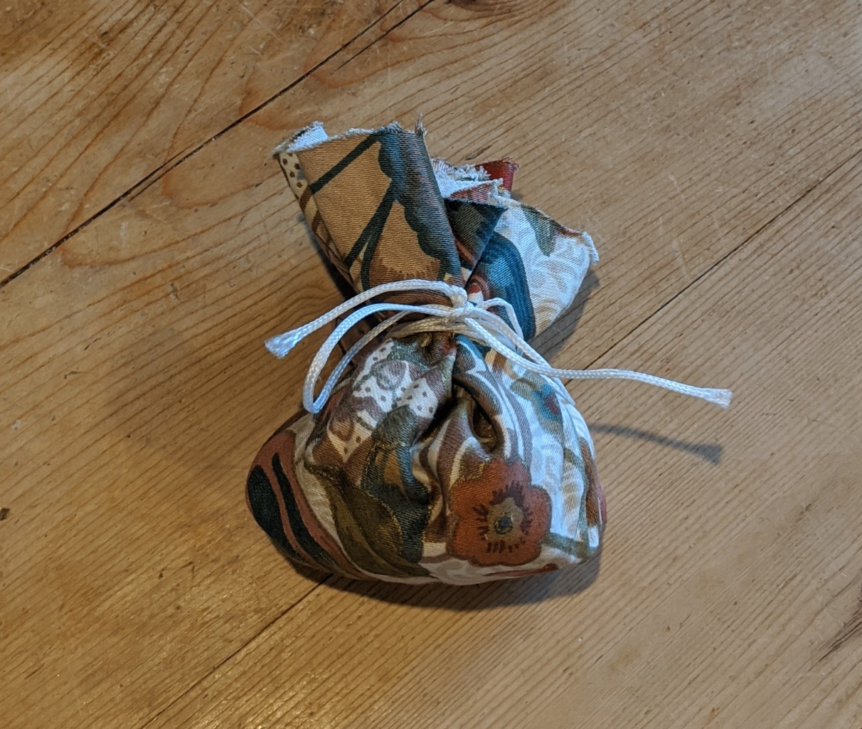 He also had a Bag of ‘problems’. These were objects wrapped up like presents each with a note (written on a disc of tree trunk) and wrapped in gift wrap.