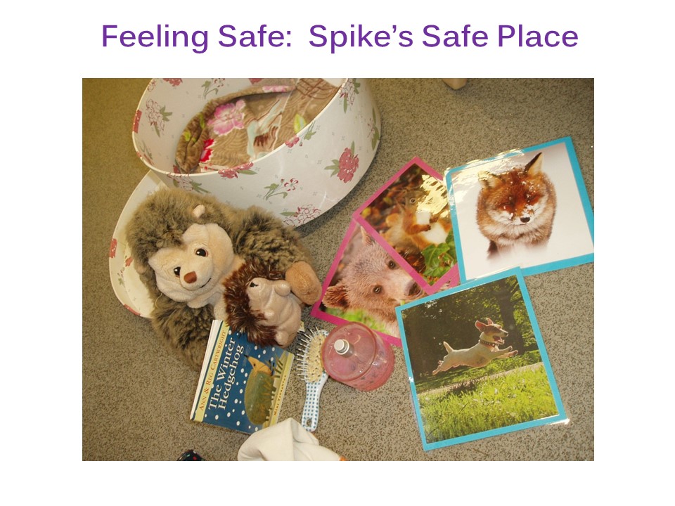 The things which helped Spike to feel safe, included his ‘teddy’ (a mini hedgehog), his snuggly cloth, his mother’s perfume, his brush, his bedtime story about a hedgehog, some tiny plasters and photos of his friends.